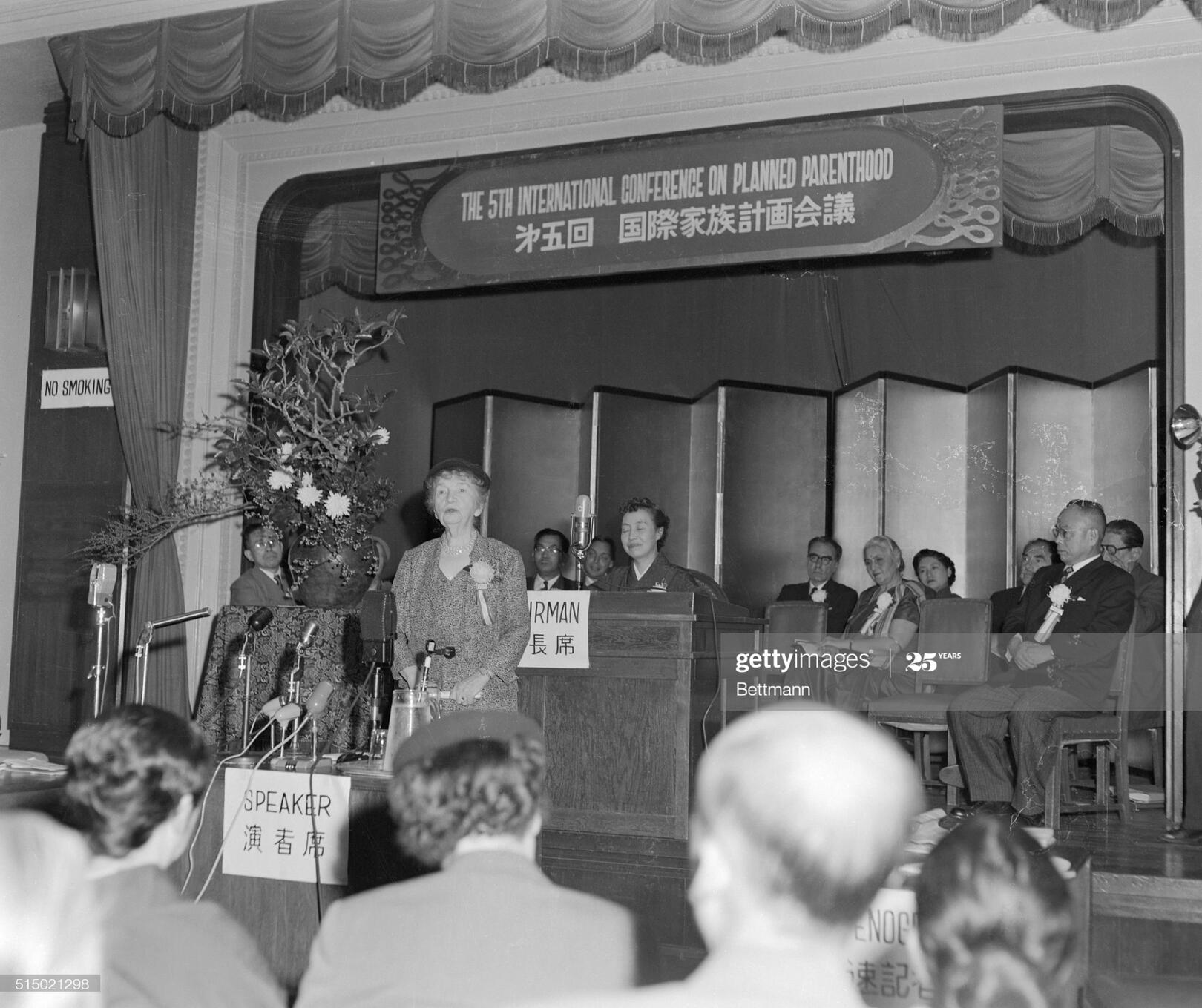 (Original Caption) The Principal Speaker at the Fifth International Birth Control Conference held in Tokyo, Margaret Sanger, is shown as she addresses the delegates who attended the five- day meeting. The conference was held in Tokyo, because Japan is one of the most overpopulated countries. Mrs. Sanger, president of the International planned parenthood federation, disclosed that an American scientist has almost perfected a small "oral contraceptive" which can be eaten like candy, and described the discovery as one that " may revolutionize the world." Photo from Bettman via Getty Images.