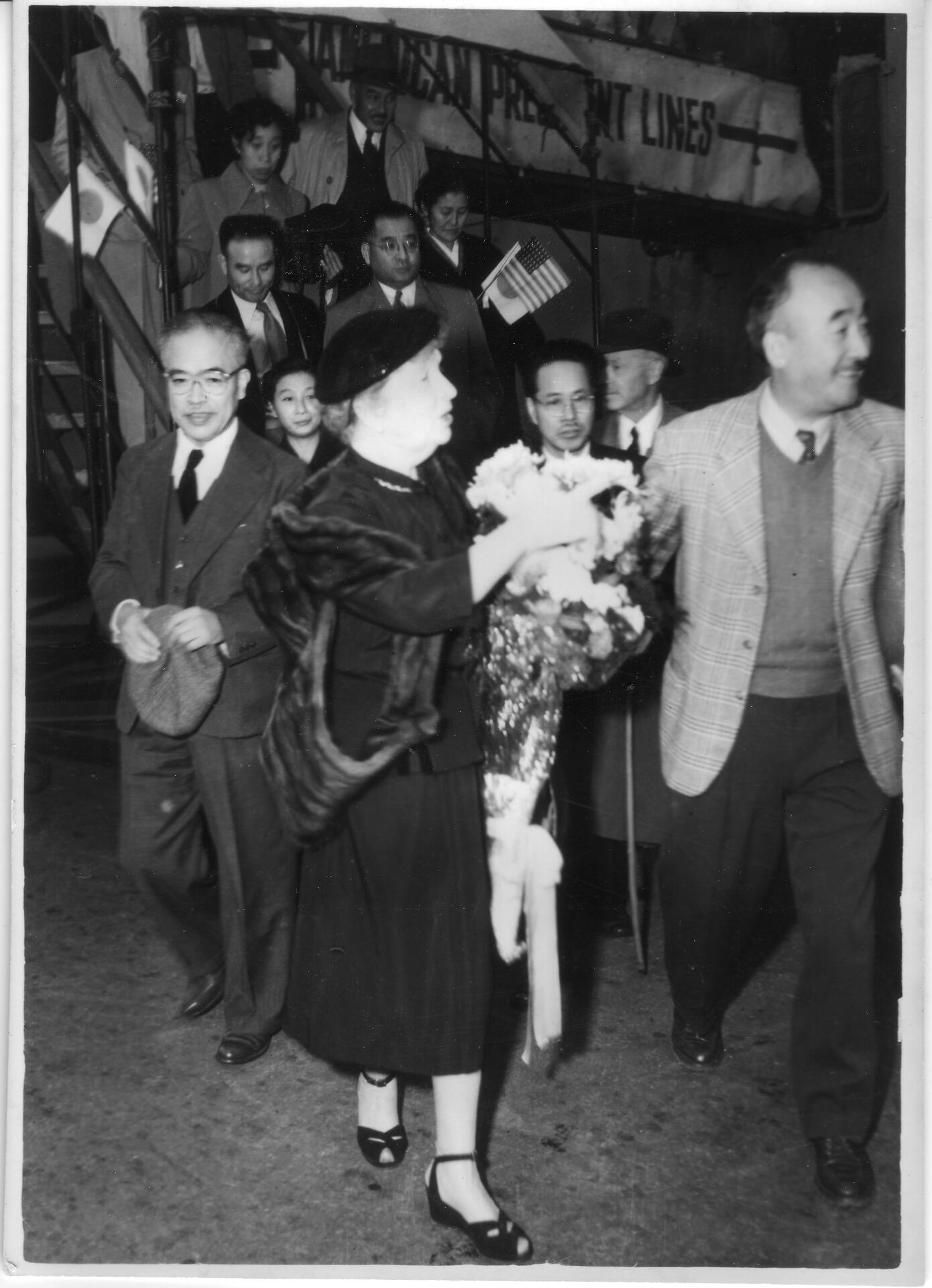 Sanger waving to the Japanese crowd upon arrival in the country in 1955. Photo from Margaret Sanger Papers Project's Website.